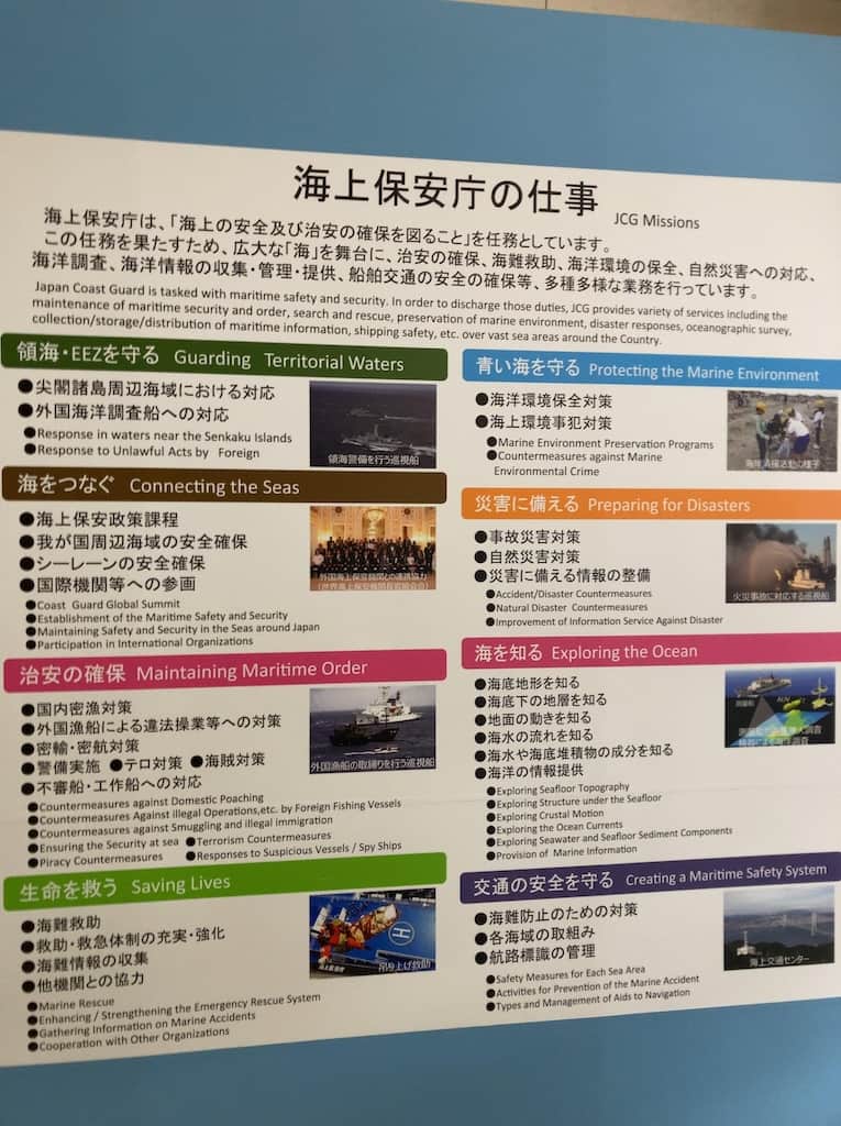 館内は海上保安庁の活動内容が分かりやすくボードで掲示されてる