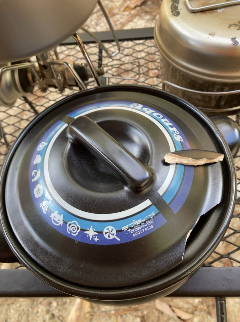 前のキャンプで貴重なAqours土鍋の蓋の上にLEDランタンを落として割ってしまった。