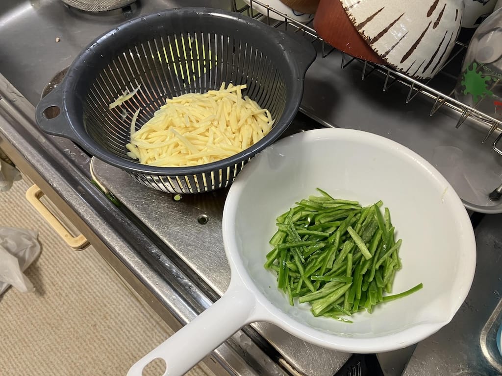 細く細く切れば肉の合間に絡まるので綺麗なバランスになるんやで