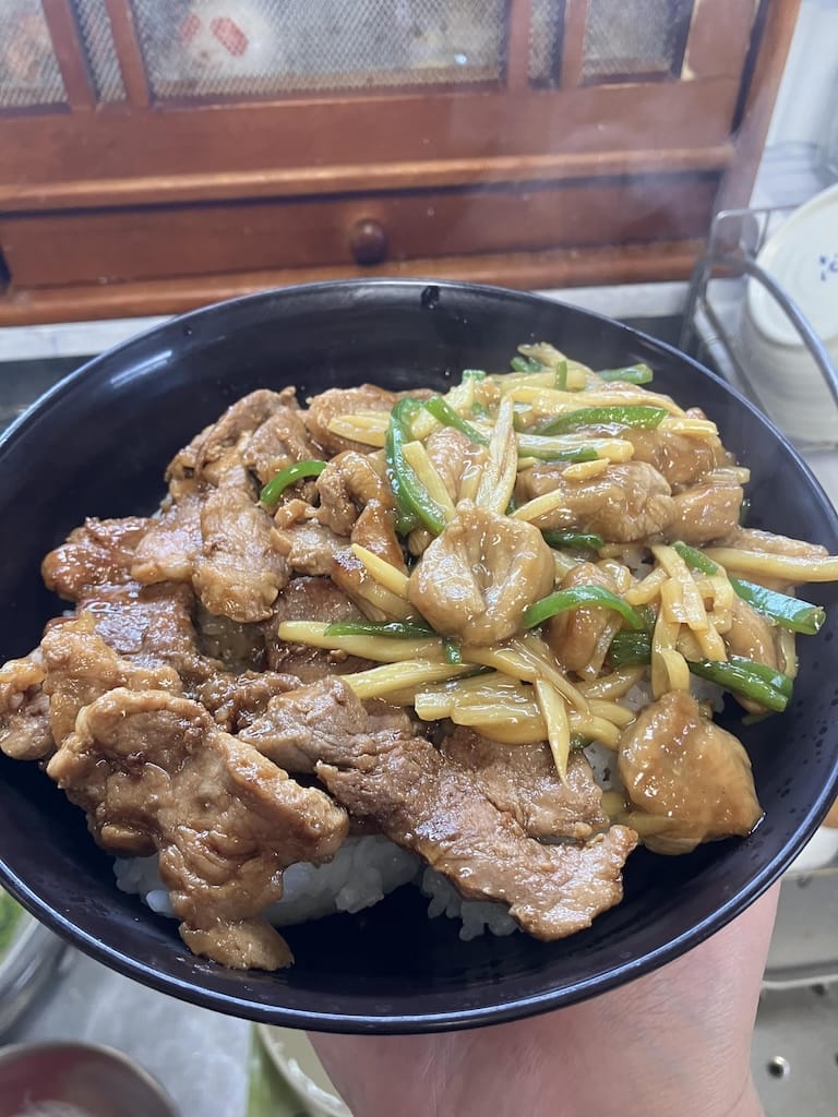 肉の切れ端焼肉のタレで炒めたもんとのハーフ&ハーフ丼や
