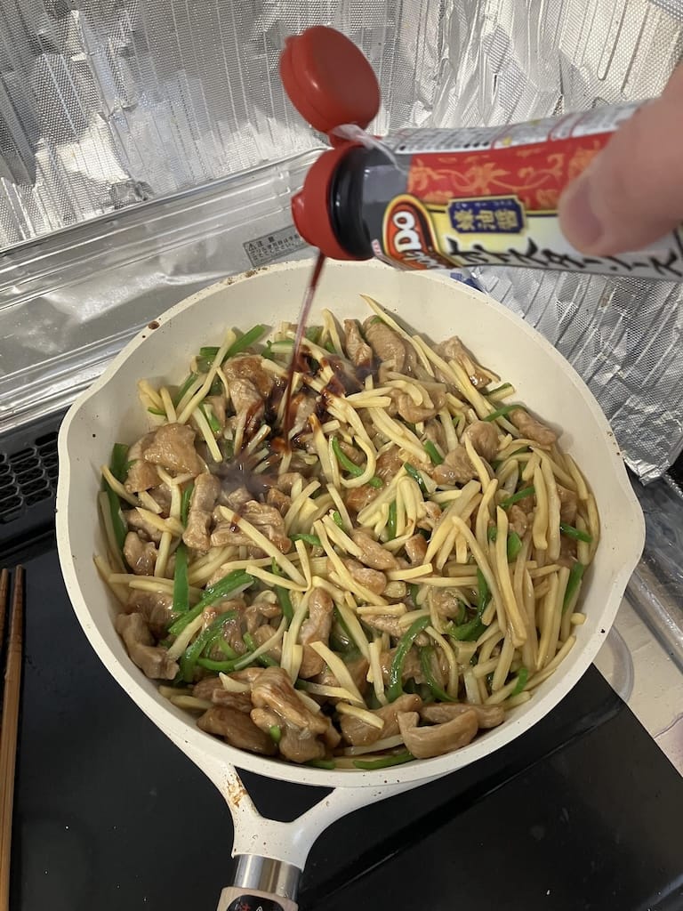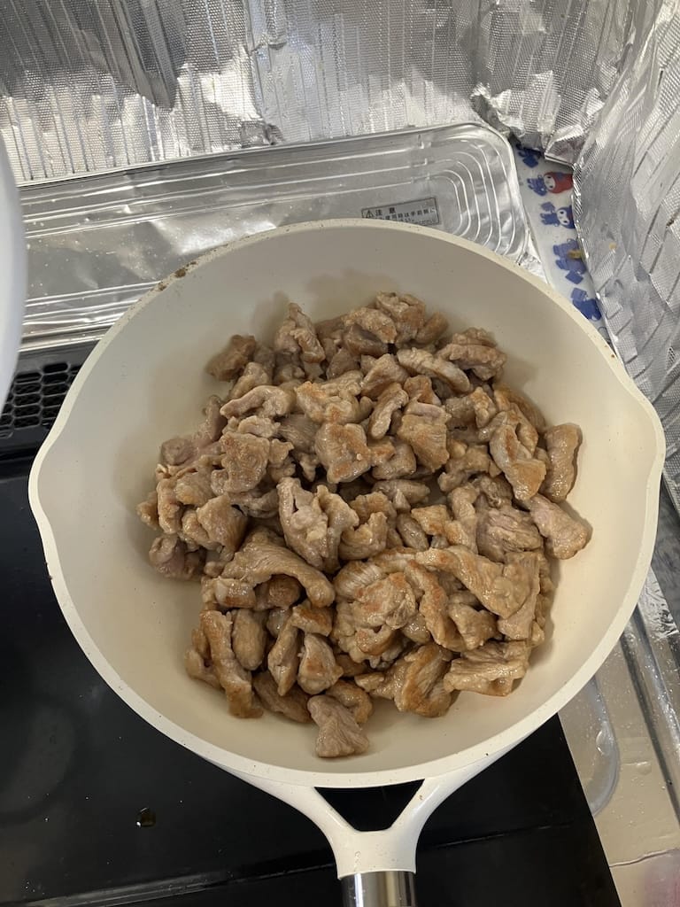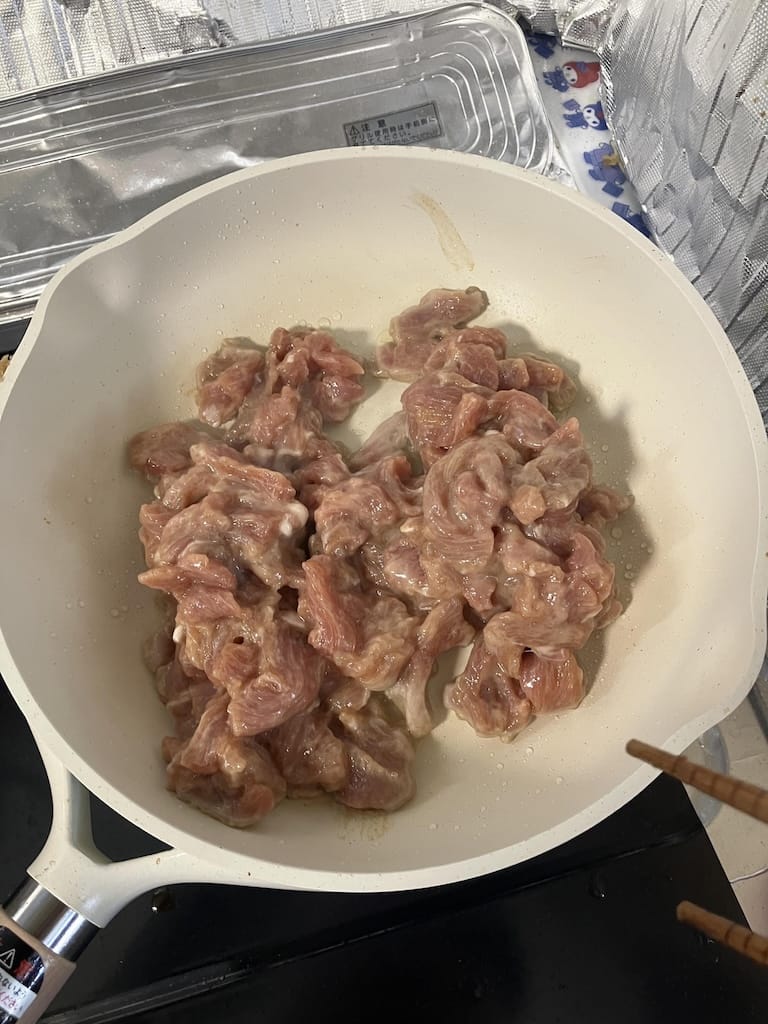 普通のタケノコ入れる場合は肉が6~7割くらい火が通った辺りで先に炒めておくとええ