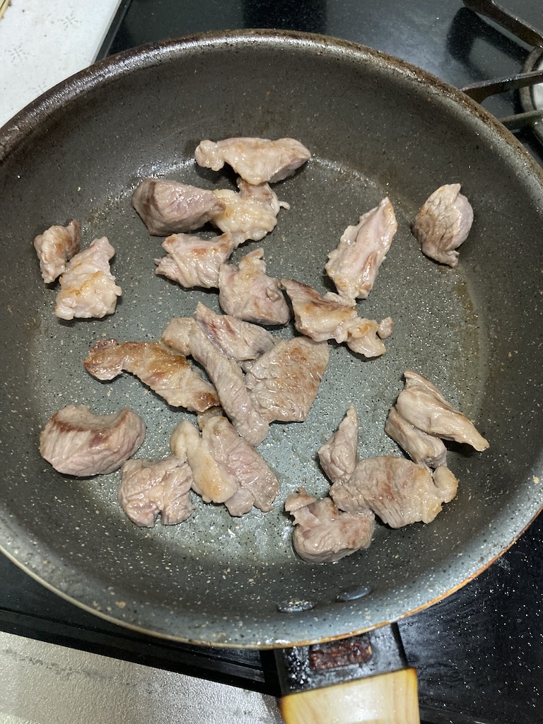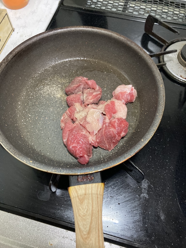 カレー用のものを使用したので油引いたフライパンに塩胡椒して表面だけ炒める。