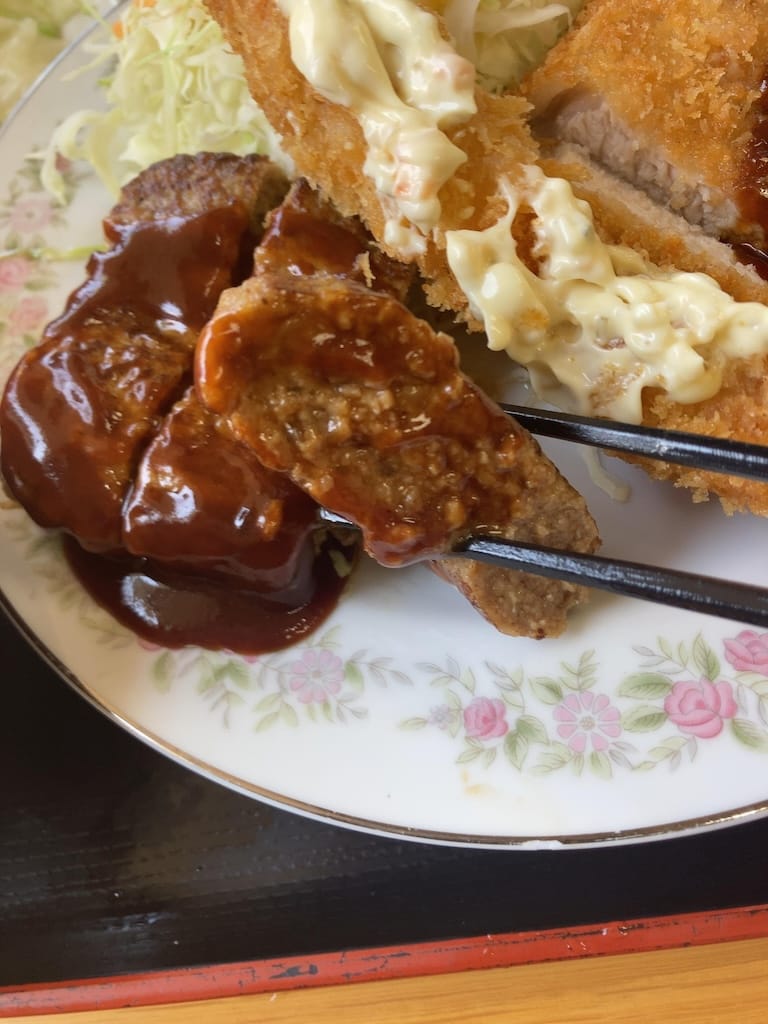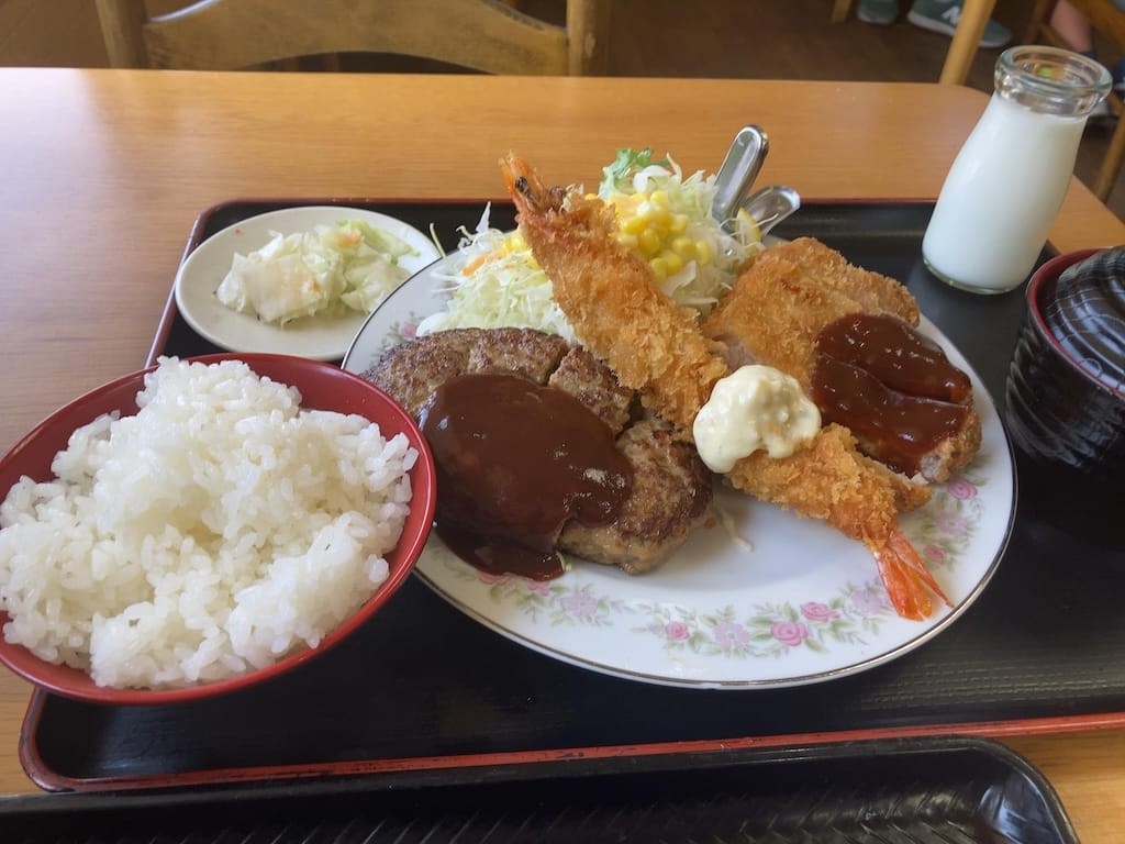 ハンバーグ、頭付きえんびフライ、トンカツ