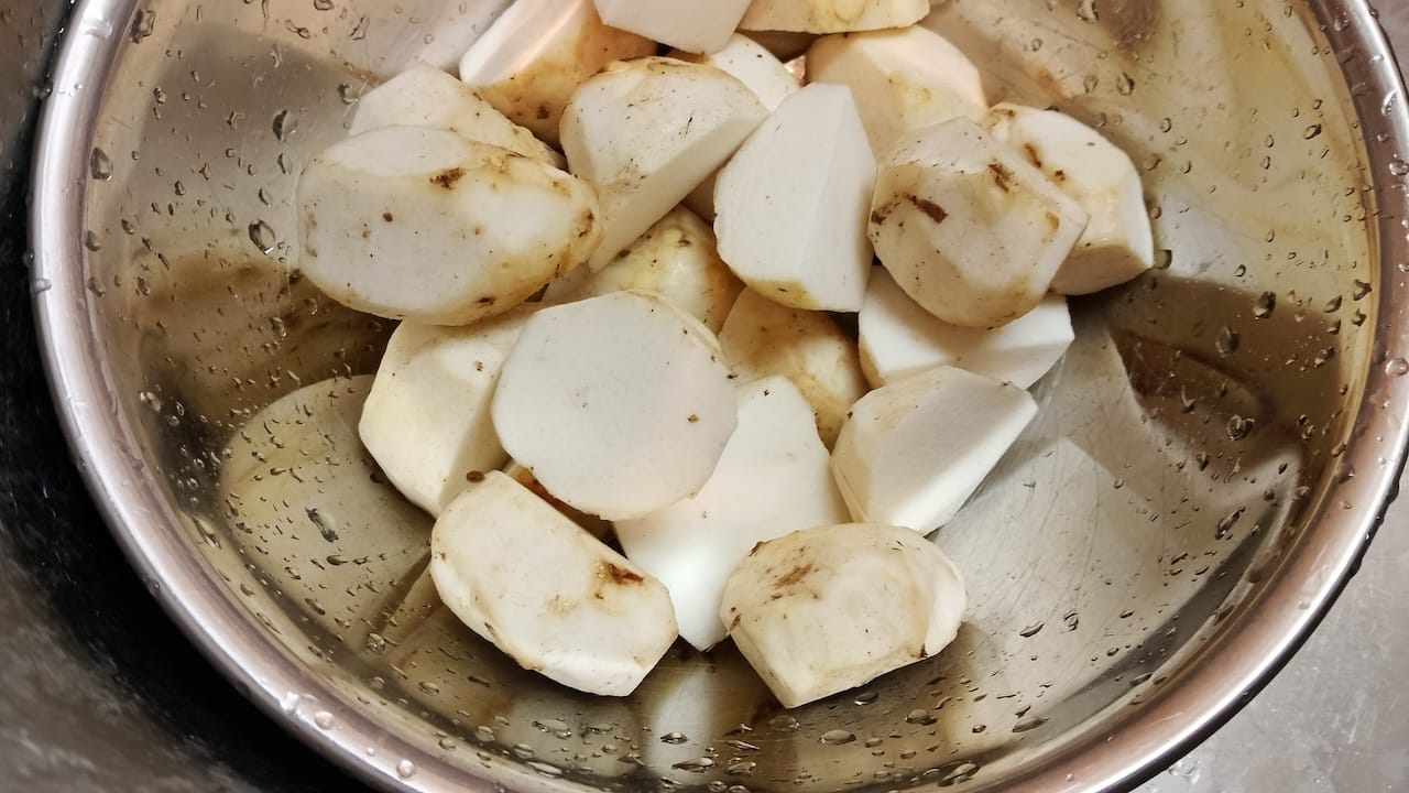 里いもの下側に十字に切れ目いれて10分くらい下茹でするんや。