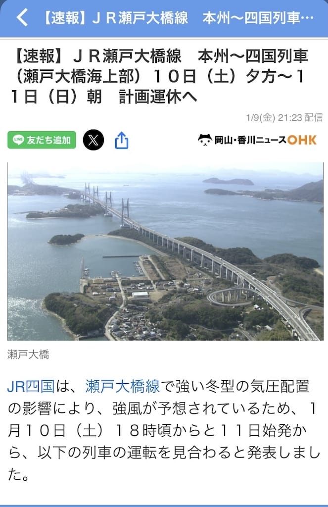最強寒波襲来の影響で週末の瀬戸大橋線のダイヤが大変不安定な状態。明