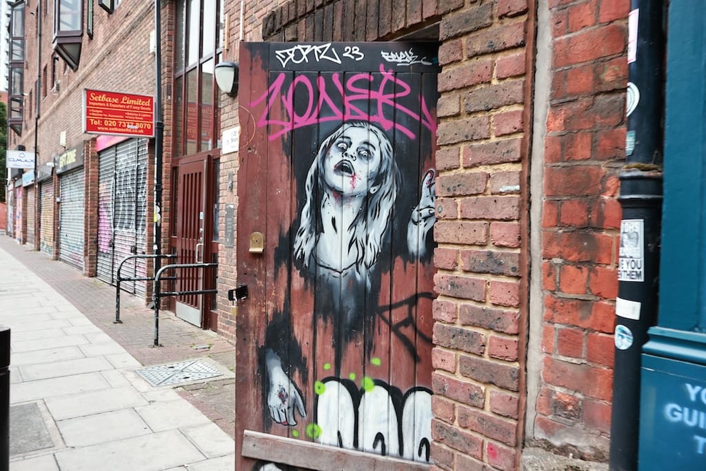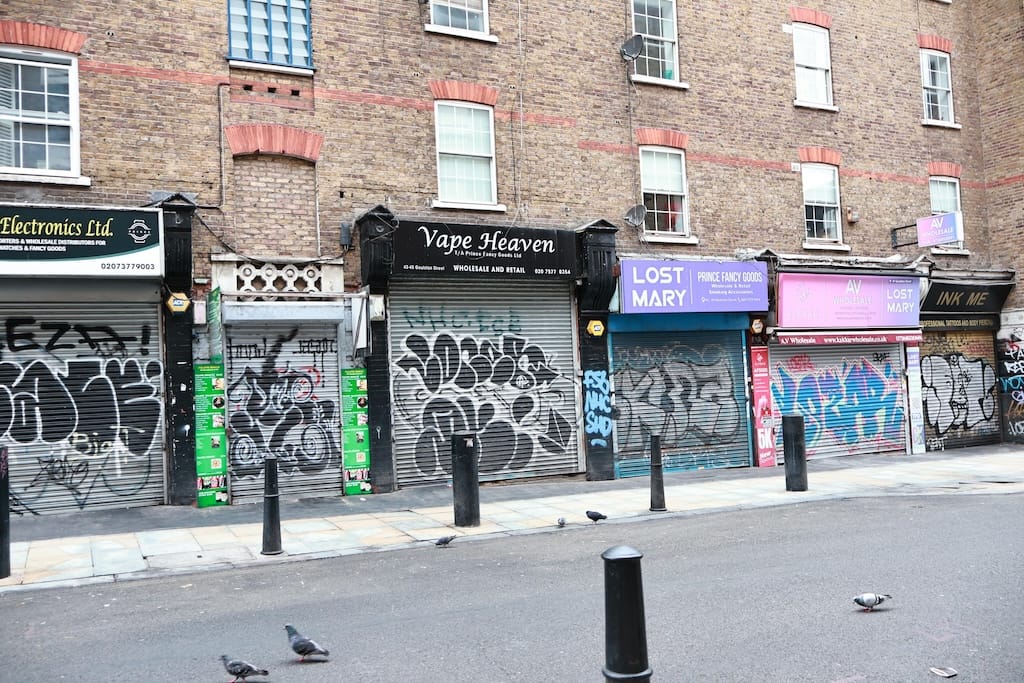 1888年当時は貧民街やったけど、現在のブリックレーンはヴィンテージマーケットやストリートアートの聖地になってるで