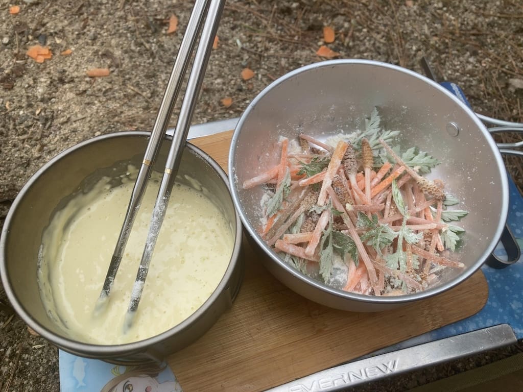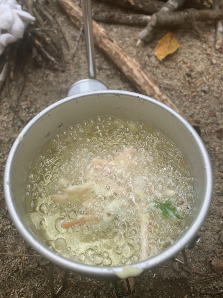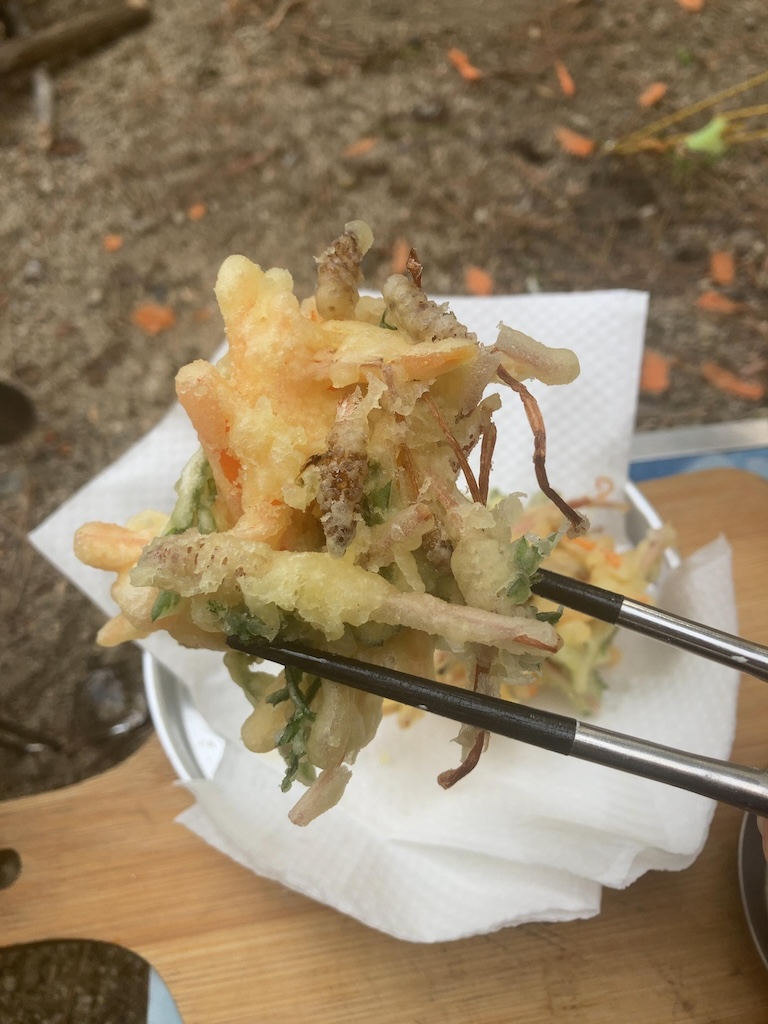 先ずは時期外れの土筆とヨモギのかき揚げ