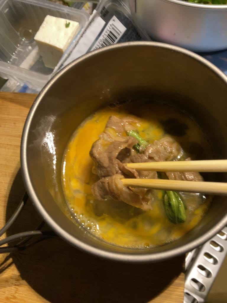 煮えすぎた肉を溶き卵に絡めて食べる